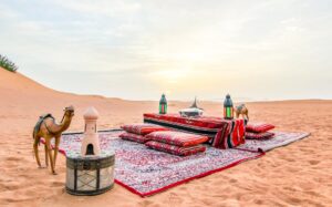 Conclude the adventure at a desert camp with a BBQ dinner offering both vegetarian and non‑vegetarian options, along with live entertainment including belly dancing, Tanoura and fire shows, henna painting, and traditional costume photo opportunities.